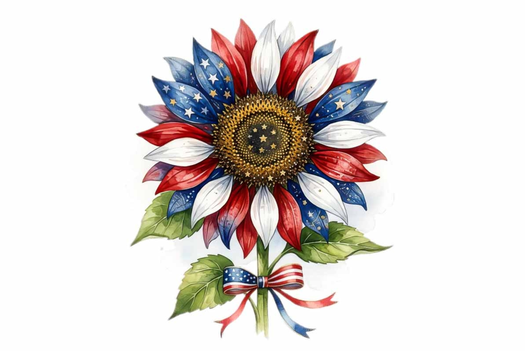 Watercolor patriotic sunflower with red white blue petals and stars, Memorial Day clipart, isolated on white, transparent background PNG, 300 dpi, high detail