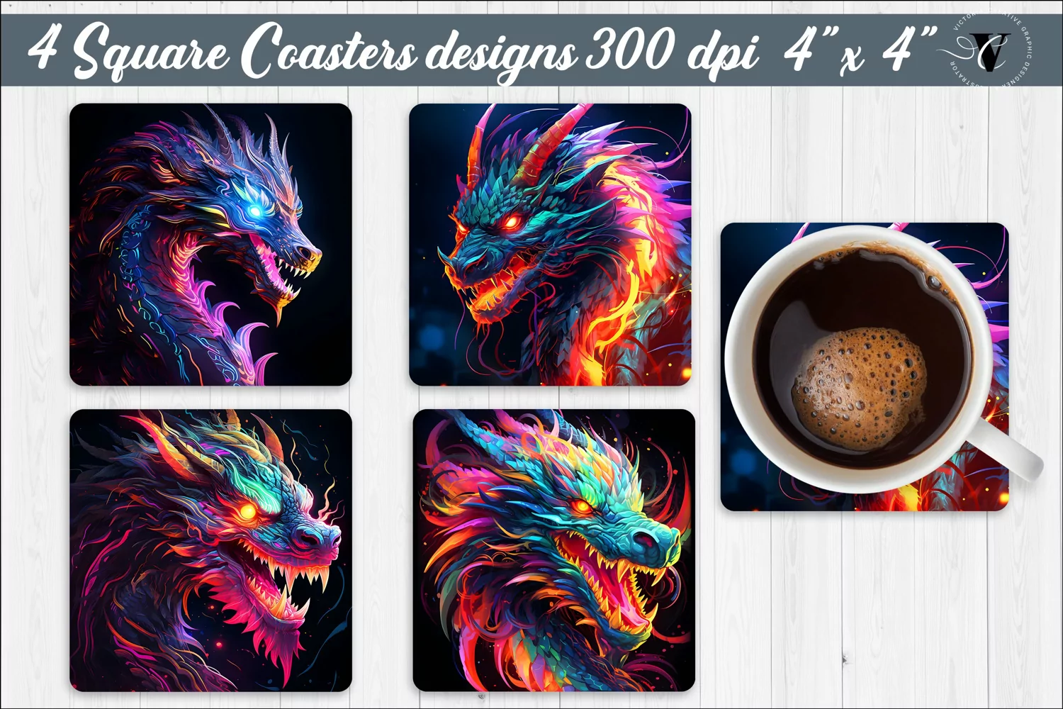 Square Coasters, Square Coasters sublimation design, Neon dragon sublimation, Neon dragon, Dragon sublimation