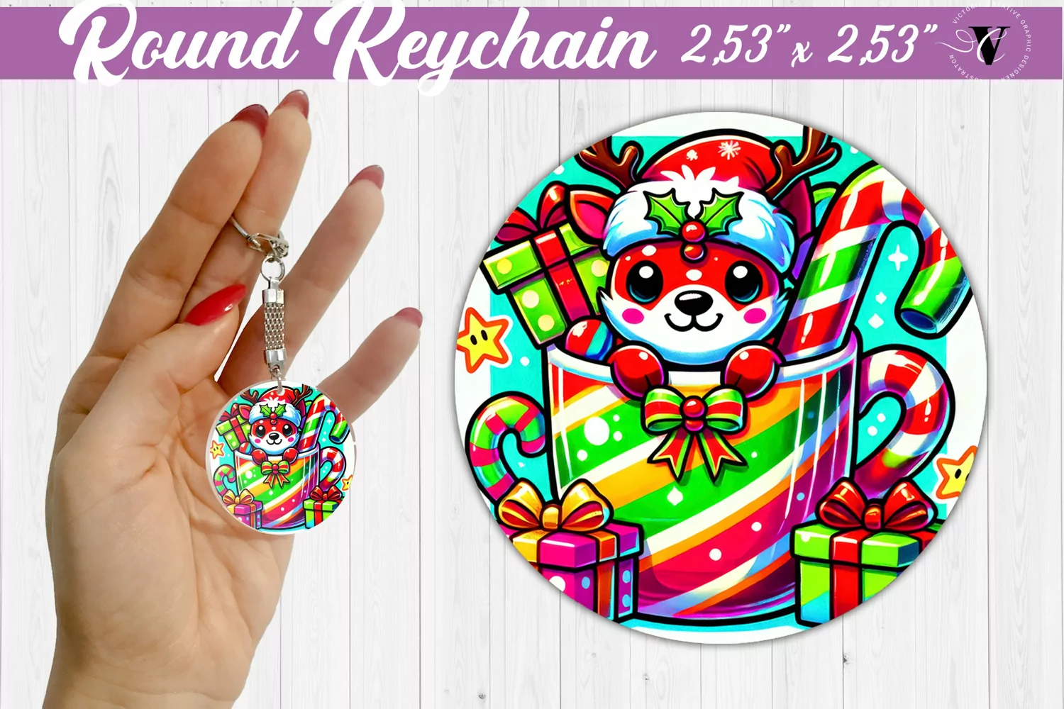 Round Keychain | Christmas Animal in Mug | Rainbow