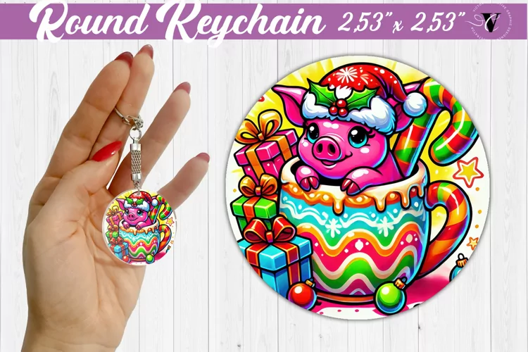 Round Keychain | Christmas Animal in Mug | Rainbow example image 1