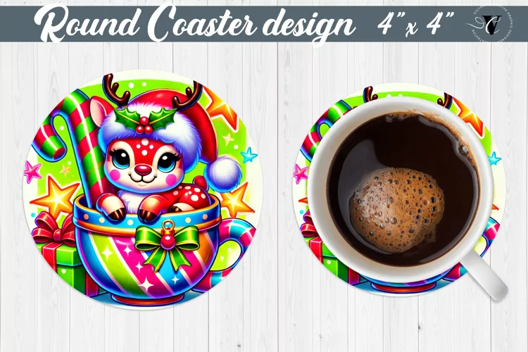 Round Coasters | Christmas Animal in Mug | Rainbow