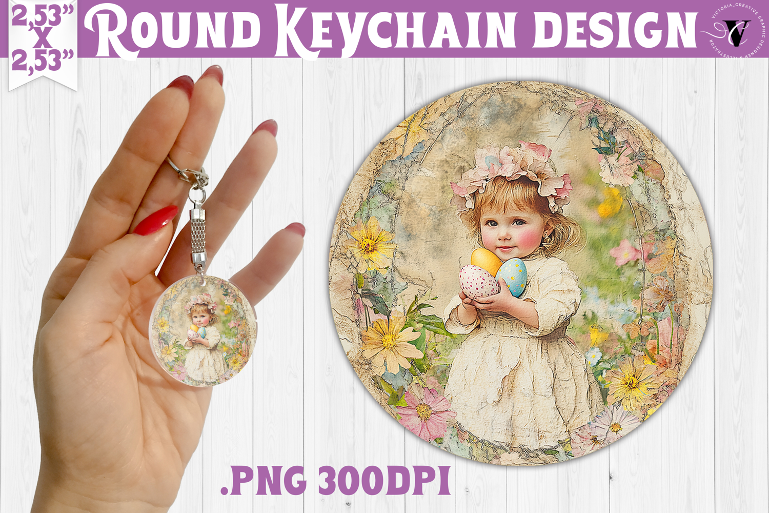 Vintage Spring Easter Girl Easter Eggs Little Girl Keychain Retro Easter Round Keychain Keychain Sublimation Design
