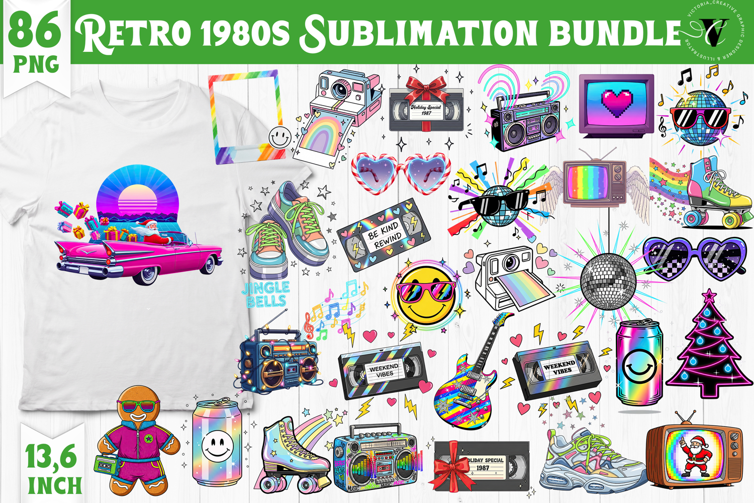This bundle captures the true retro spirit of the 80s — holographic tones, chrome details, and pure disco energy! Each design is carefully illustrated to bring nostalgic joy and creative flair to your festive season.