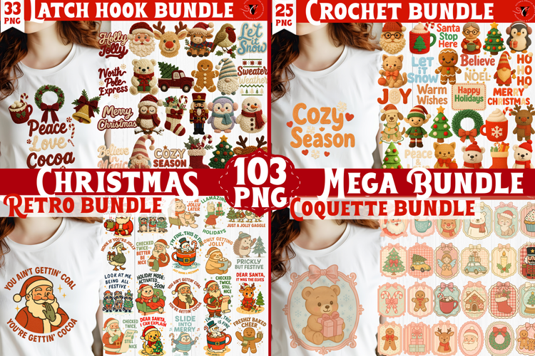 This set combines adorable crochet-style illustrations, cozy latch hook textures, nostalgic retro Christmas art, and sweet coquette holiday elements, giving you everything you need to create warm, charming, and festive designs.