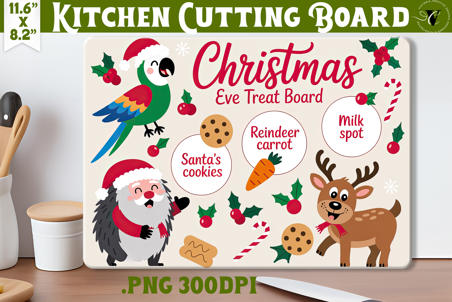 This design features bright holiday elements such as cookies, ornaments, treats, cute characters, and labeled spots for Santa’s snacks, making it ideal for crafting custom serving boards, cutting boards, home décor, and holiday gifts.