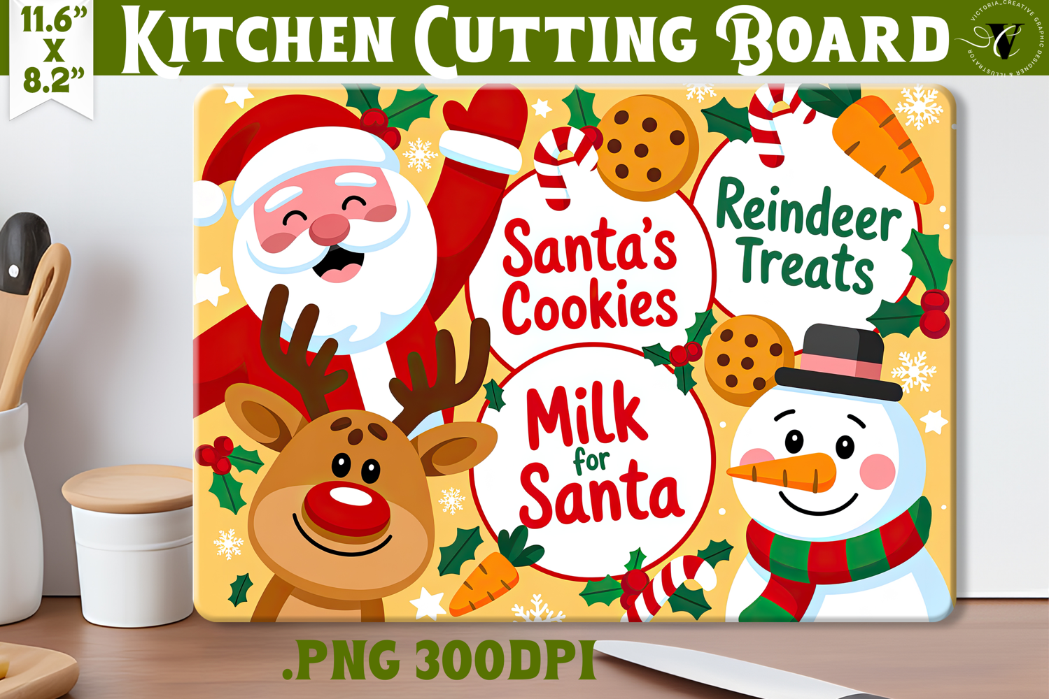 This design features bright holiday elements such as cookies, ornaments, treats, cute characters, and labeled spots for Santa’s snacks, making it ideal for crafting custom serving boards, cutting boards, home décor, and holiday gifts.