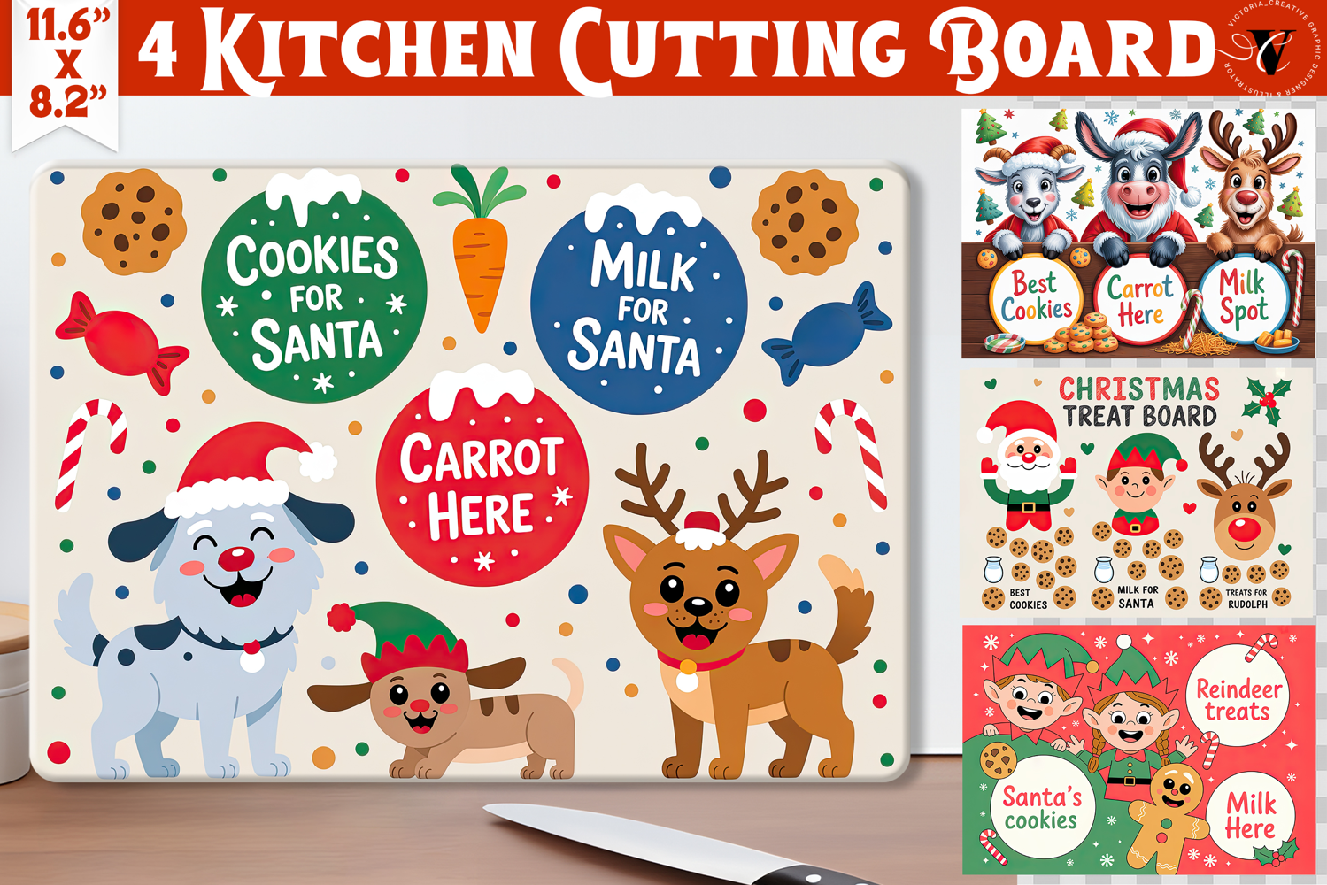 This design features bright holiday elements such as cookies, ornaments, treats, cute characters, and labeled spots for Santa’s snacks, making it ideal for crafting custom serving boards, cutting boards, home décor, and holiday gifts.