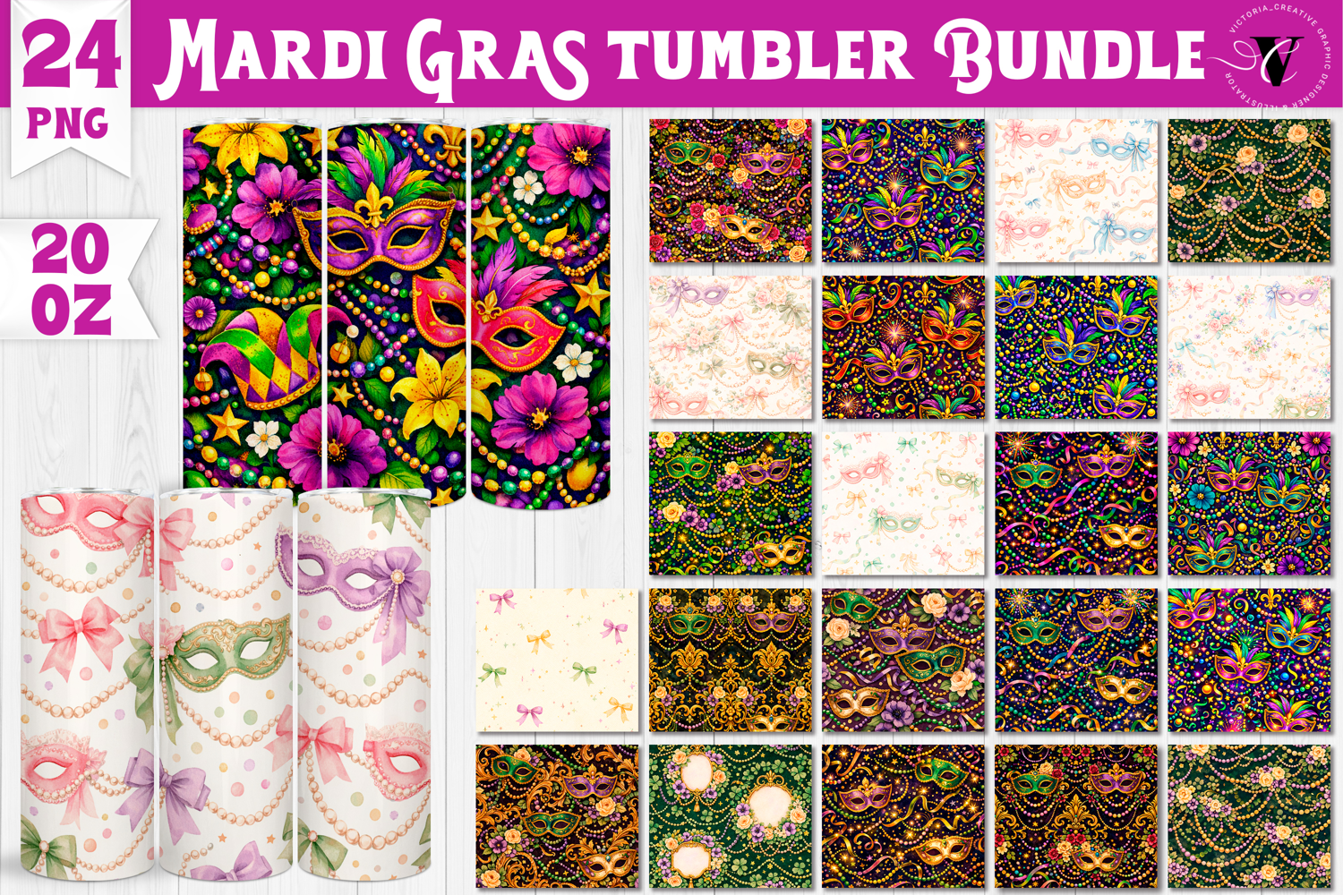 Celebrate Mardi Gras in style with this vibrant Mardi Gras Tumbler Wrap Bundle, featuring seamless carnival-inspired patterns filled with elegant masquerade masks, festive beads, florals, ribbons, and rich decorative details.