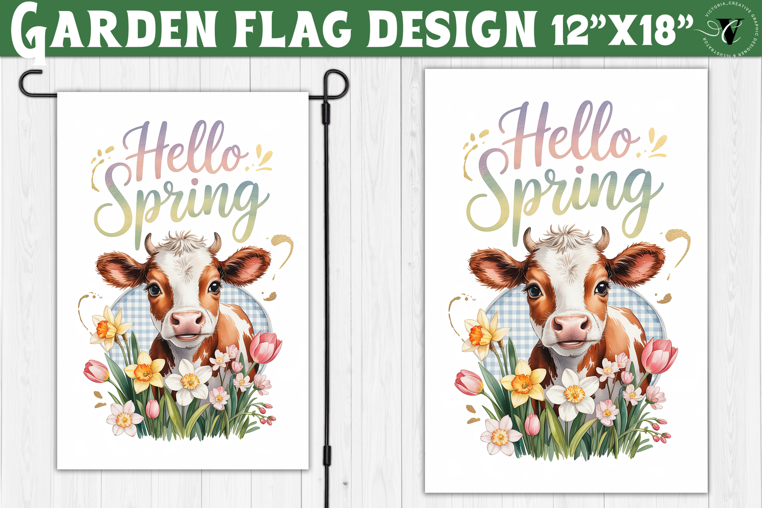 Bring cheerful farmhouse charm to your outdoor décor with this Spring Garden Flag PNG, featuring adorable cows, spring florals, rustic wagons, watering cans, and popular seasonal phrases like Hello Spring, Welcome Spring, Spring Blessings, and the playful Moo-dy Spring.