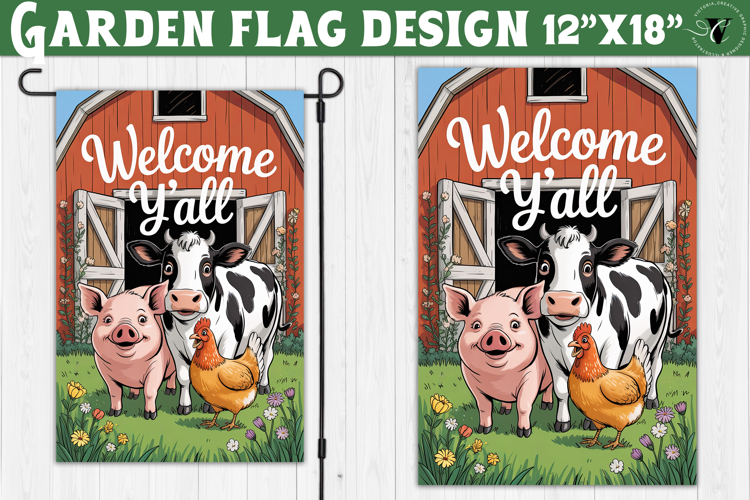 Perfectly formatted for 12x18 inch garden flags, this high-resolution PNG file is ready for sublimation, printing, and DIY outdoor décor projects. The bold lettering and cute cartoon farm illustrations make it eye-catching from a distance, ideal for welcoming guests with rustic country charm.