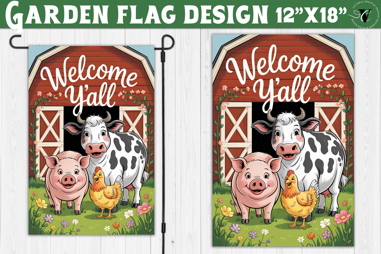 Perfectly formatted for 12x18 inch garden flags, this high-resolution PNG file is ready for sublimation, printing, and DIY outdoor décor projects. The bold lettering and cute cartoon farm illustrations make it eye-catching from a distance, ideal for welcoming guests with rustic country charm.