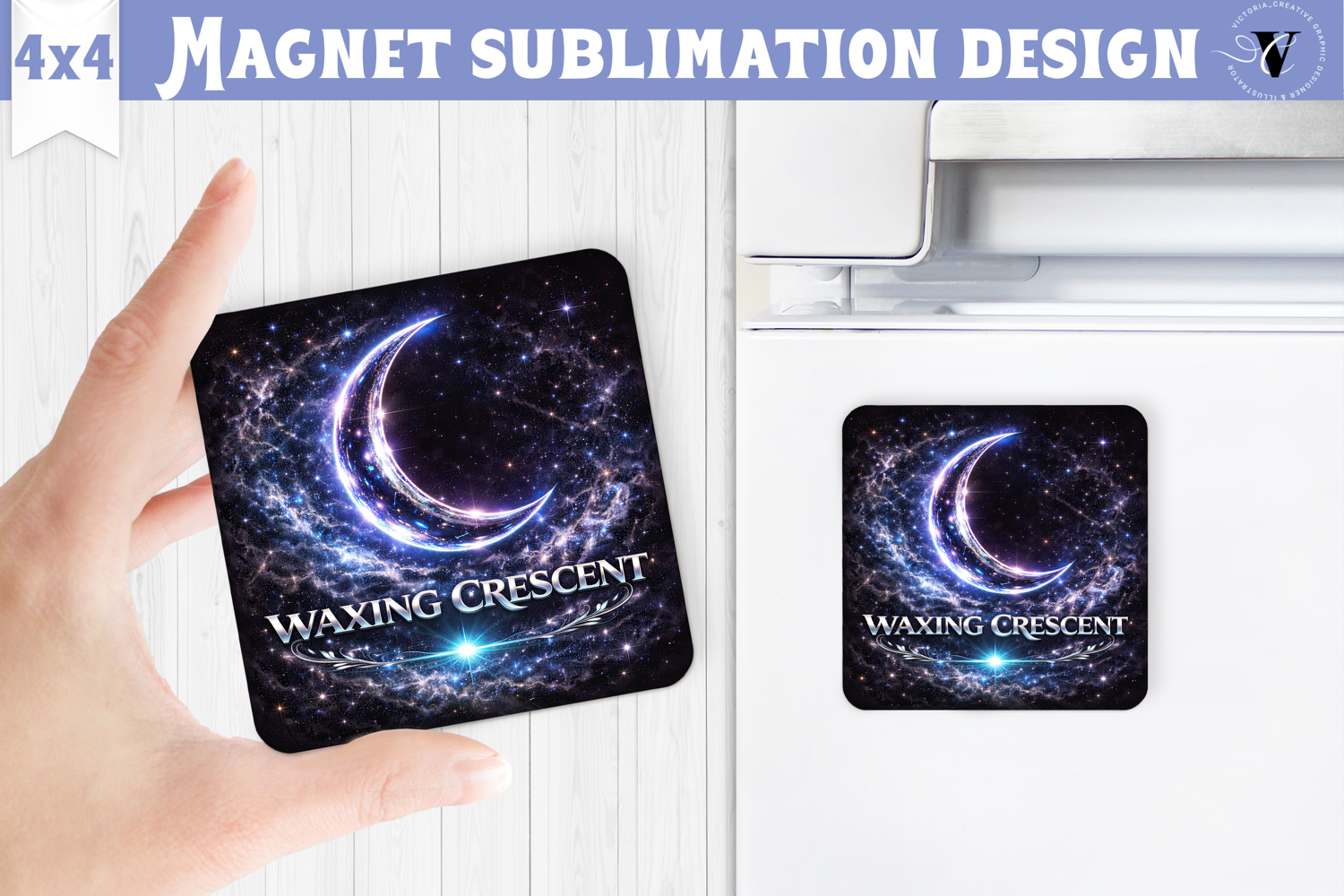 Create beautiful custom fridge magnets with this Moon Phase Sublimation Design, featuring a glowing lunar phase surrounded by a dramatic cosmic galaxy background. Specially sized for 4x4 inch sublimation magnet blanks, this high-resolution PNG is perfect for crafting astrology-inspired magnets, moon phase gift sets, or celestial home décor.