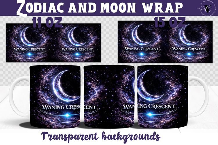 Mug wrap design with beautifully detailed zodiac illustrations such as Pisces, Aquarius, Sagittarius, Leo, Virgo, Taurus, Aries, Capricorn, Scorpio, Gemini, Cancer, and Libra, along with a complete collection of luminous moon phase designs including Full Moon, New Moon, First Quarter, Last Quarter, Waxing Crescent, Waning Crescent, Waxing Gibbous, and Waning Gibbous.