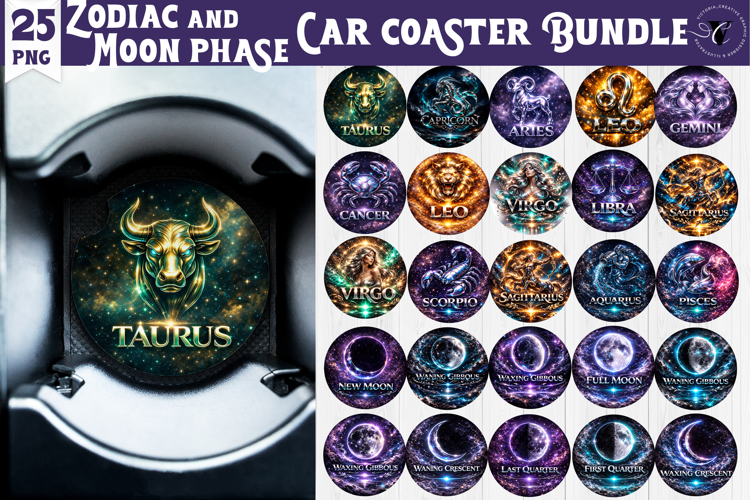 Zodiac Car Coaster Bundle | Moon Phases Metallic Zodiac example image 1