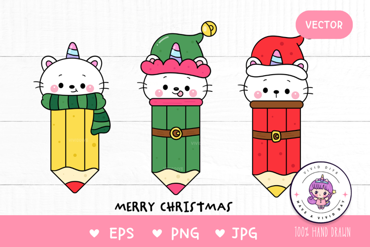 Cute Unicorn cat Christmas Pencil Elf Santa kawaii clipart example image 1
