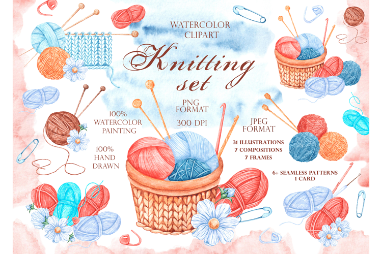This "Knitting" clipart consists of separate illustrations and compositions: Knitting needles - Crochet hook - Threads - Balls of threads - Yarn - Basket - Pins - Knitwear - Flowers - Leaves.