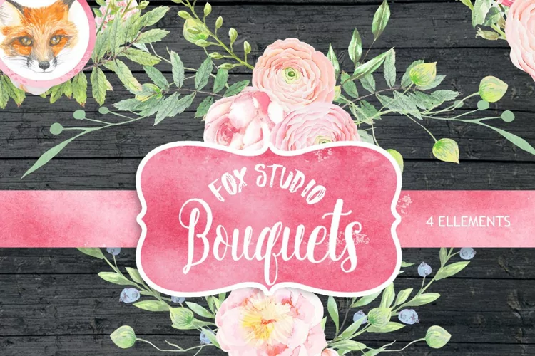 This set of 4 high quality Watercolor Ranunculus Bouquets