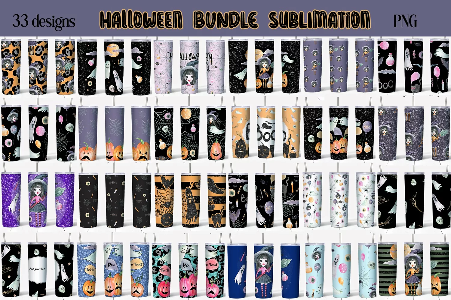 A bundles of tumblers with Halloween design for sublimation printing. Designs include creepy characters, pumpkins, witch, seamless patterns, glitter backgrounds and more