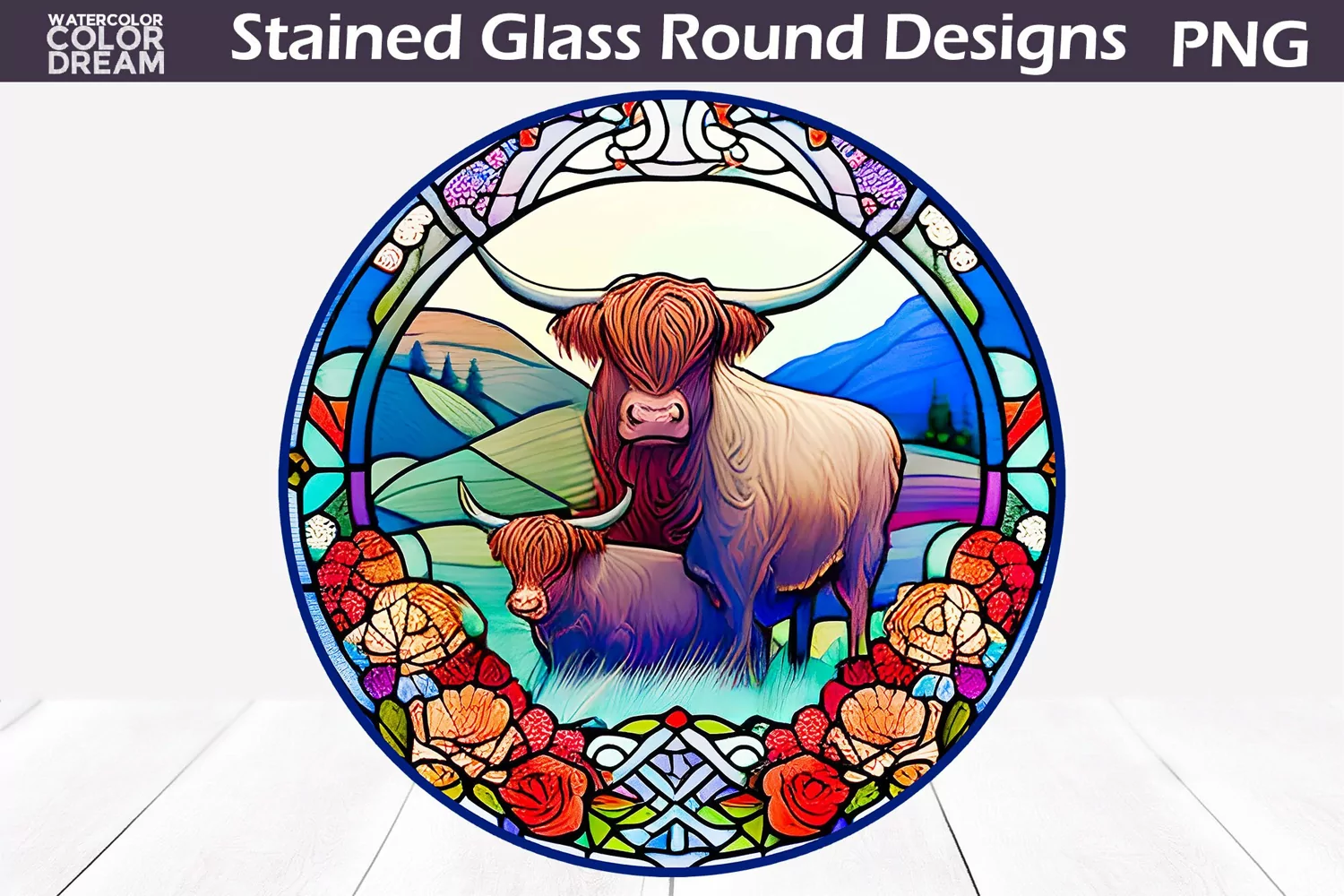 Highland Cow Stained Glass PNG | Cow Sublimation