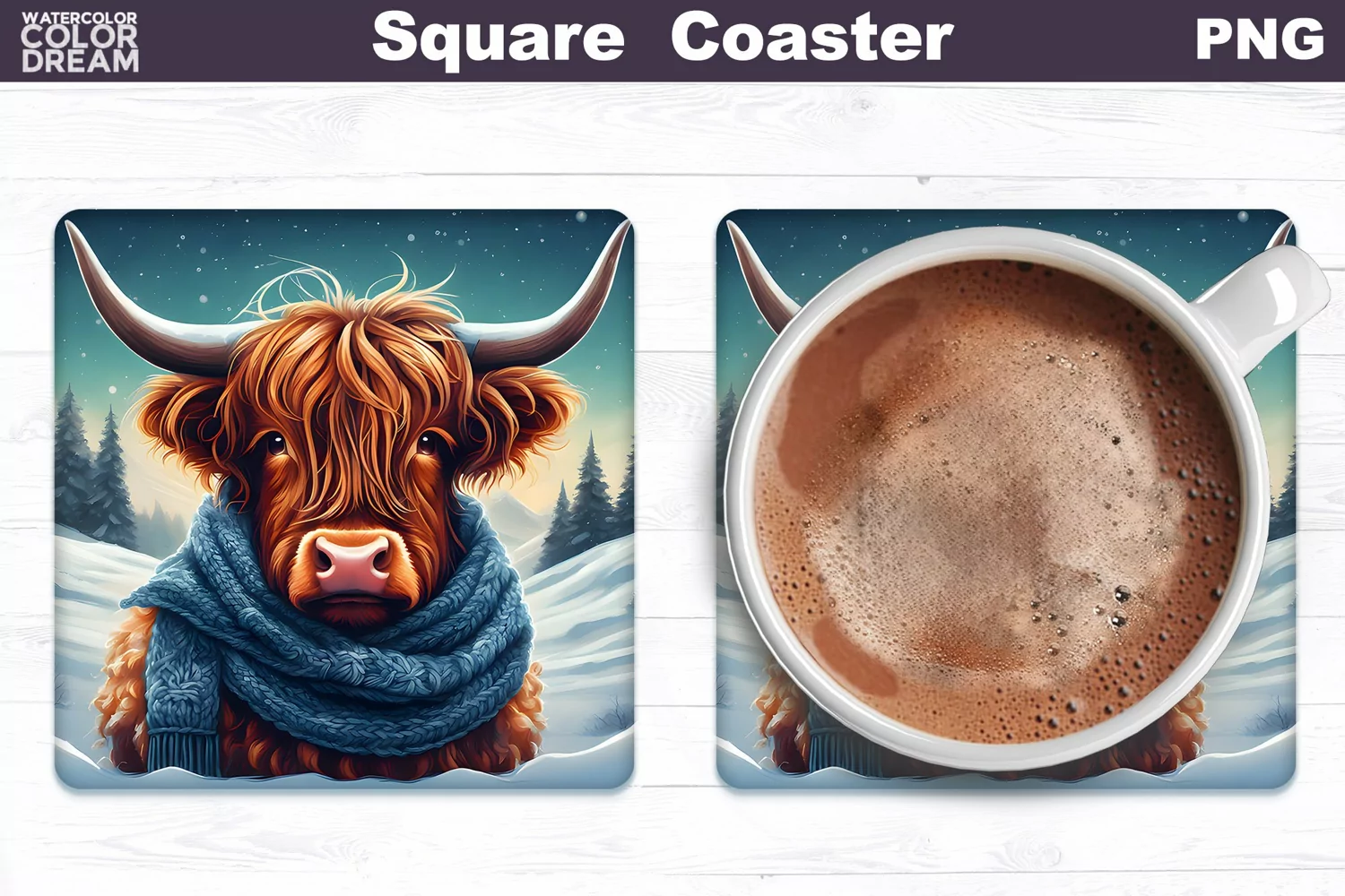 Highland Cow Square Coaster | Winter Cow Coaster PNG example image 1