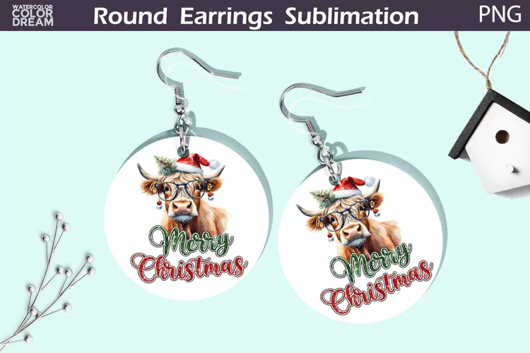 Merry Christmas Round Earrings | Highland Cow Earring PNG example image 1
