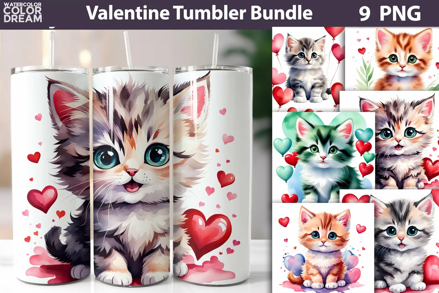 Watercolor Cat Valentine Tumbler Bundle I Cute Cat Tumbler