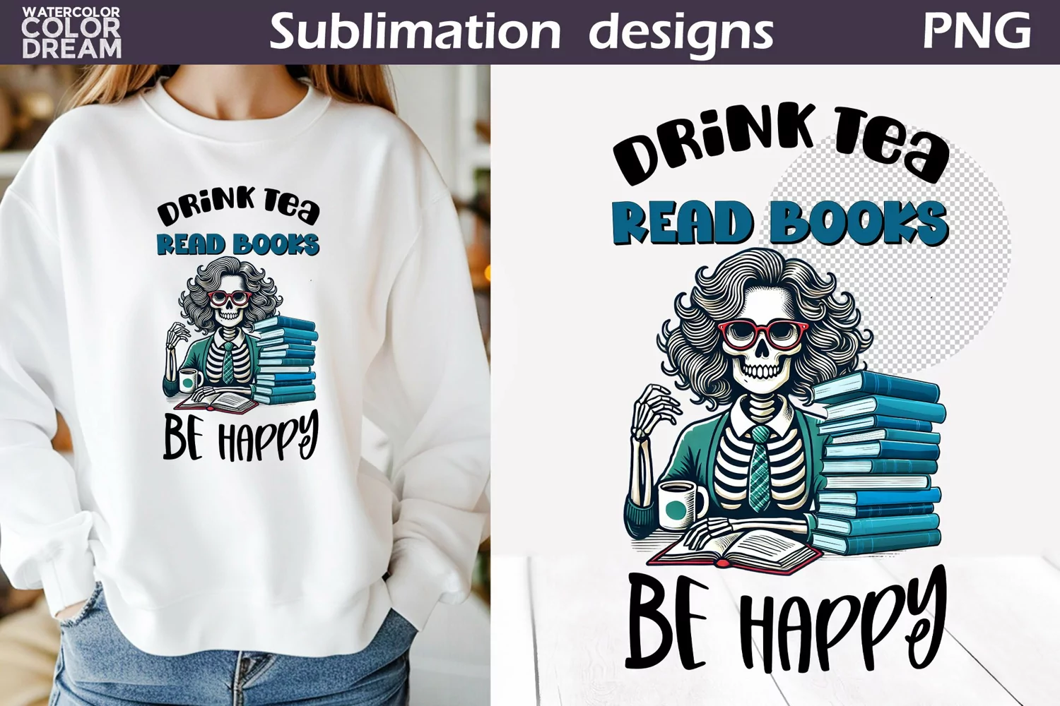 Funny Book Sublimation | Drink Tea Read Books Be Happy