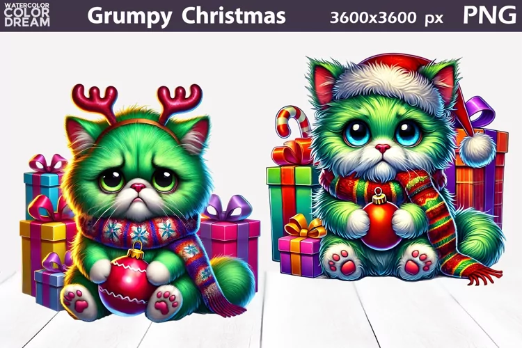 Grumpy Green Cat Christmas Clipart | Funny Cat Sublimation