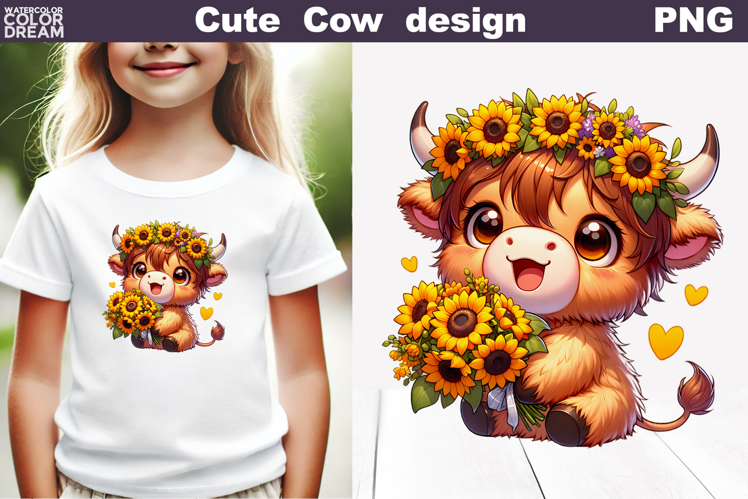 This adorable cartoon highland cow design features a smiling baby calf holding a bouquet of sunflowers and wearing a floral crown. Perfect for kids’ T-shirts, nursery wall art, baby shower decorations, and farm-themed crafts. High-resolution PNG file with transparent background included.