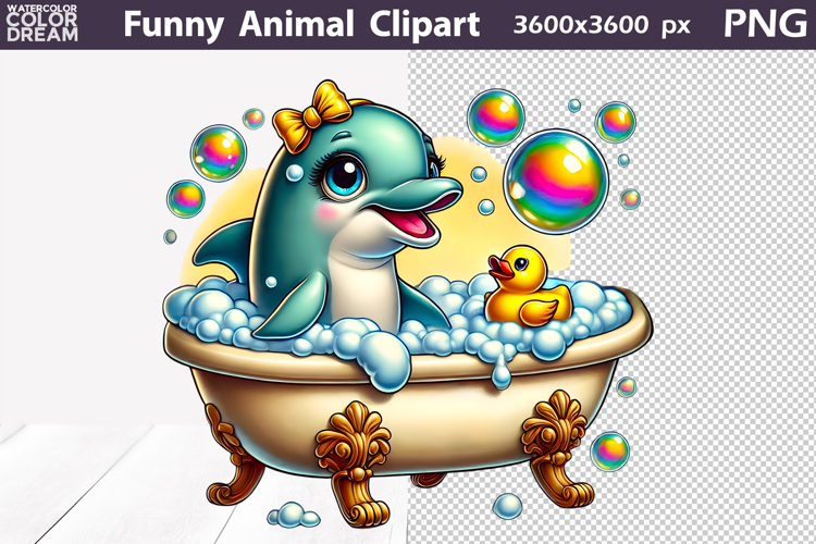 Cute Dolphin in Bathtub Clipart | Funny Animal Bath Time PNG