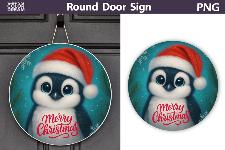 Cute Penguin Round Sign | Merry Christmas Door Sign example image 1