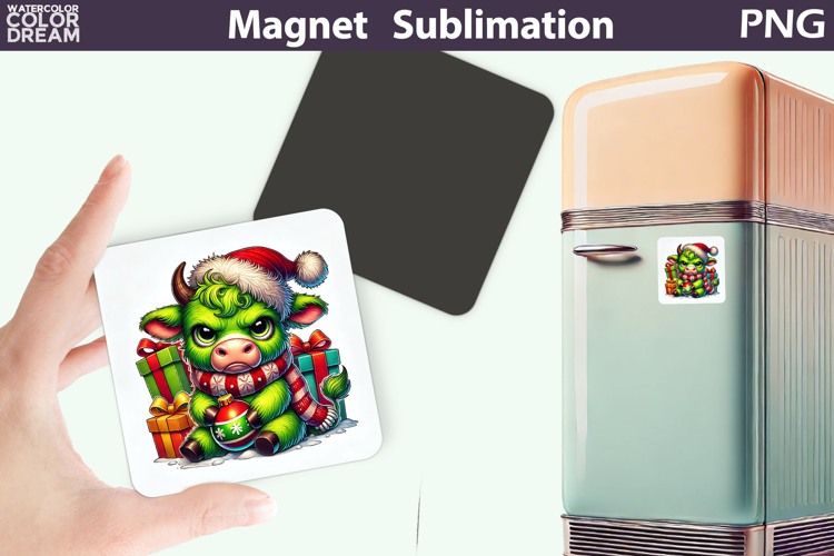 Green Grumpy Cow Magnet | Christmas Animal Sublimation example image 1