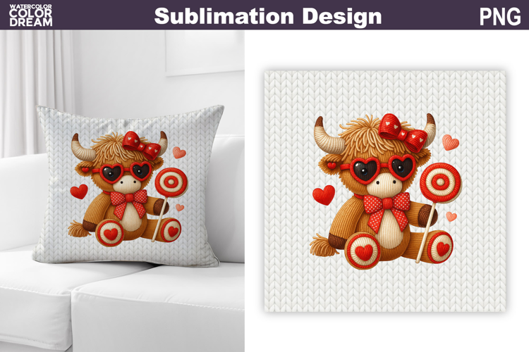 Highland Cow Valentine Heart Pillow Design | Cow Knitted Heart Valentines Day