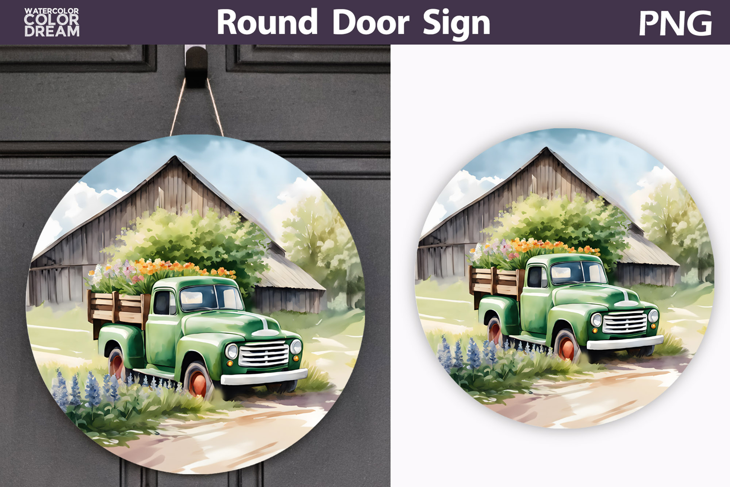 Spring Green Truck Round Sign | Vintage Farm Truck Sublimat example image 1