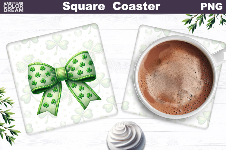 Green Bow Clover Square Coaster | St. Patrick's Day Sublimat example image 1