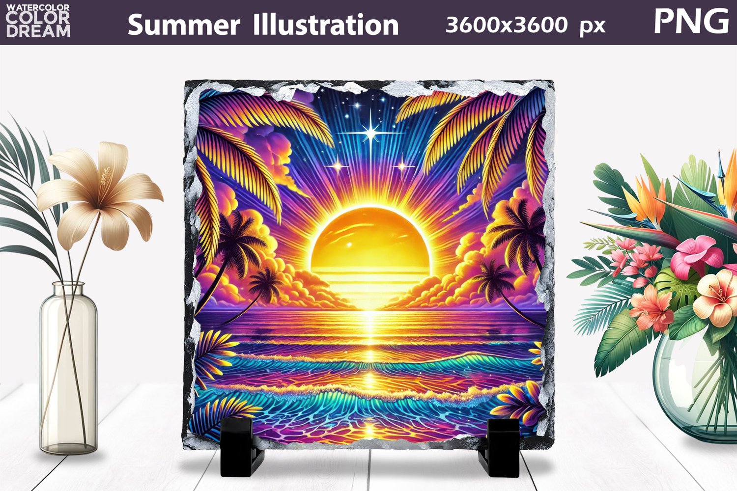 Slate Pillow Poster Card Puzzle Tropical Sunset Ocean Illustration Neon Beach Palm Tree Artwork Colorful Seaside Summer Design Radiant Sun Rays Coastal Scene Vibrant Island Paradise Graphic Glowing Horizon Water Reflection Retro Tropical Beach Aesthetic Bold Ocean Wave Composition Summer Vacation Coastal Art