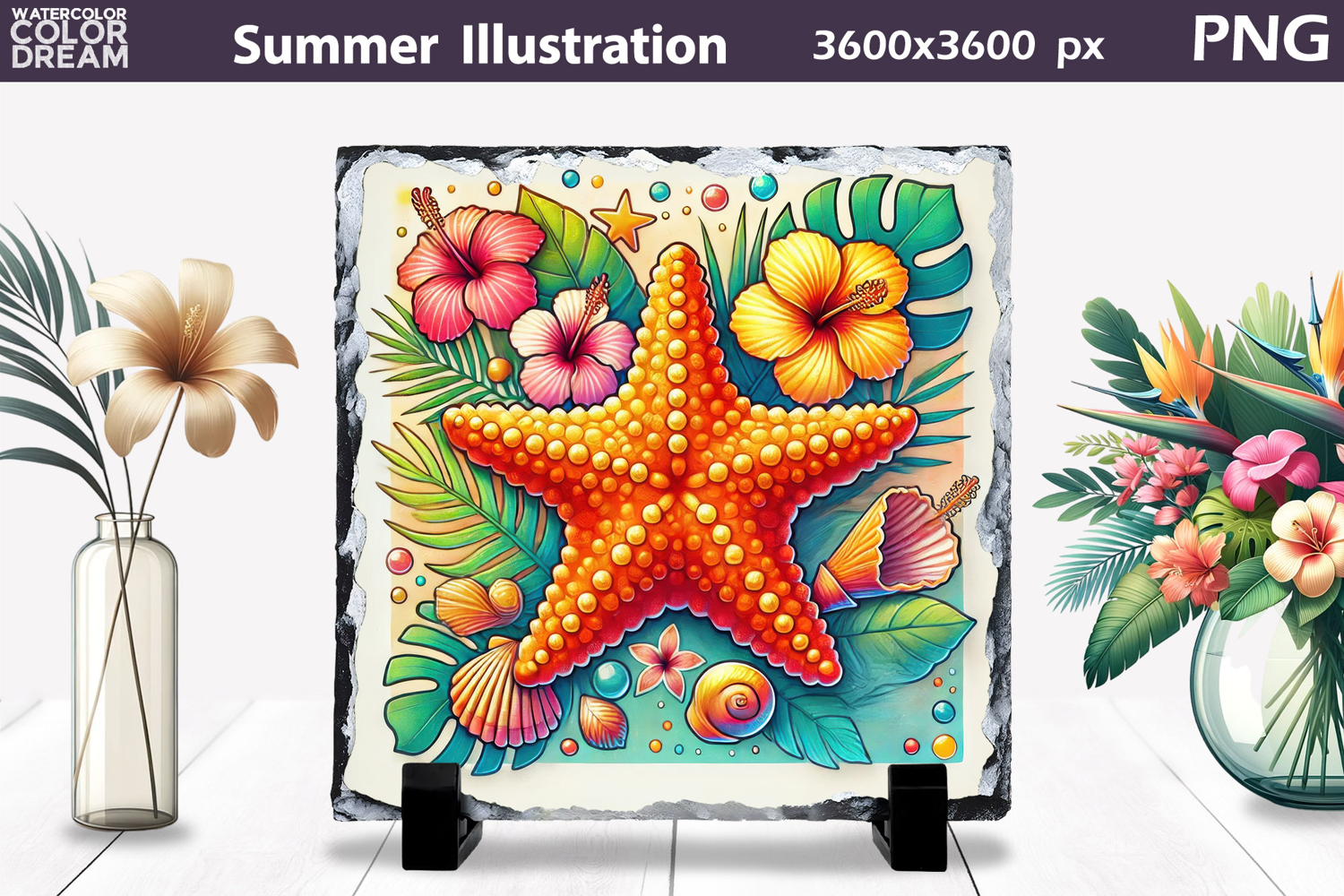 Slate Pillow Poster Card Puzzle Tropical Starfish Illustration Hibiscus Floral Beach Artwork Colorful Seashell Ocean Design Coastal Summer Marine Graphic Bright Island Vacation Art Palm Leaf Tropical Composition Vibrant Seaside Decor Illustration Exotic Ocean Life Artwork Summer Beach Botanical Design