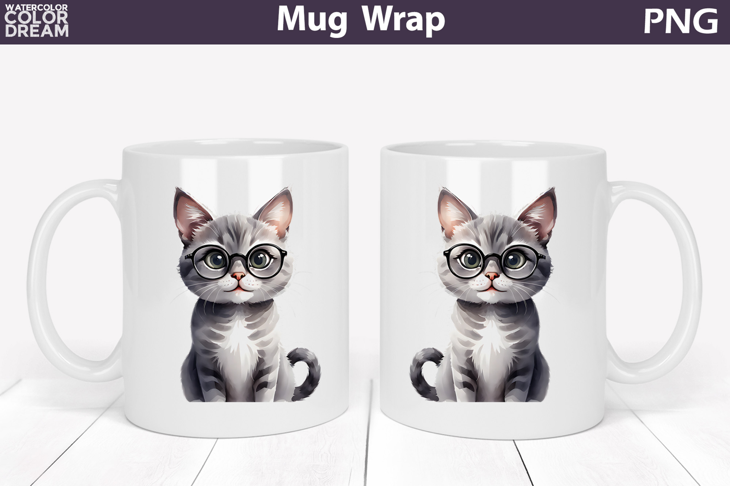 Cute Cat Mug Wrap PNG | Glasses Kitten Sublimation example image 1