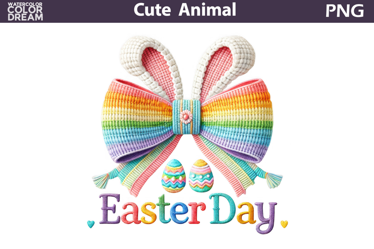 Cute Easter Shirt Design Pillow Coaster T Shirt Mug Tumbler Tote Bag Poster Easter Day Rainbow Bow Clipart Pastel Bunny Ears Sublimation Design Knitted Rainbow Ribbon Illustration Easter Egg Holiday Graphic Spring Pastel Bow Decor Colorful Holiday Ribbon Art Yarn Texture Easter Clipart Pastel Seasonal Illustration