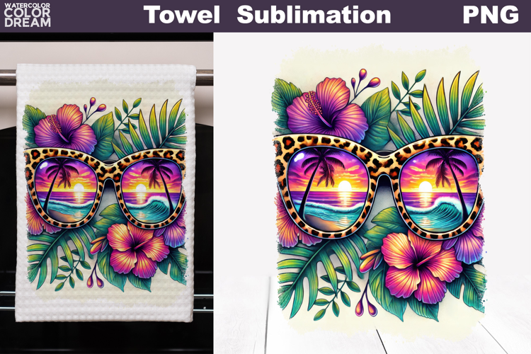 Towel Vibrant Seaside Kitchen Decor Summer Tea Towel Coastal Design Tropical Leopard Sunglasses Kitchen Towel Sublimat Sunset Reflection Beach Artwork Hibiscus Floral Island Illustration Palm Tree Ocean Sunset Graphic Colorful Summer Beach Accessory Print Tropical Vacation Home Towel Design Exotic Coastal Kitchen Artwork