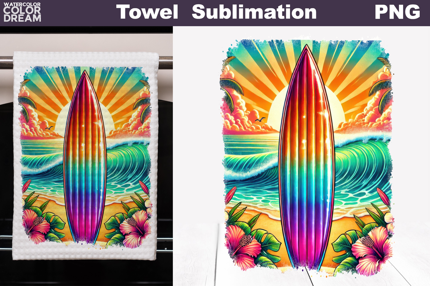 Towel Coastal Kitchen Decor Graphic Vibrant Seaside Towel Artwork Tropical Surfboard Kitchen Towel Sublimation Summer Beach Tea Towel Design Sunset Ocean Wave Artwork Hibiscus Tropical Textile Print Beach House Home Accessory Design Surfing Summer Illustration Ocean Sunset Beach Graphic