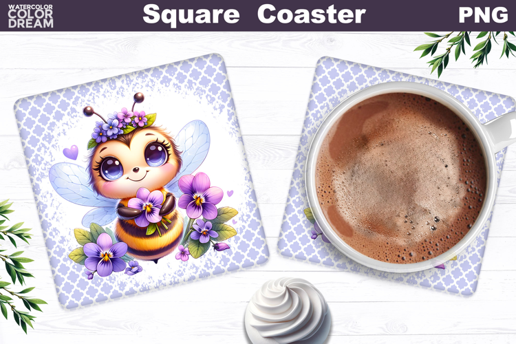 Bee Square Coaster Bumblebee Violet Floral Coaster Magnet Keychain Card Tag Print Floral Animal Square Coaster Spring Garden Blossom Cartoon Sublimation Golden Bee Flowers Sublimation Whimsical Animal Floral Square Coaster Cute Bumblebee Blossom Purple Pansy Bee Square Coaster