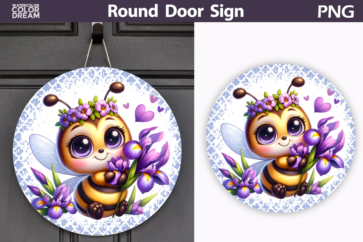 Door Sign Porch Decor Wall Art Kitchen Sign Farmh Cute Bee Round Door Sign Png Spring Floral Welcome Porch Decor Design Adorable Bee Nursery Wall Art Printable Bee Purple Iris Flower Spring Sign Pastel Cottage Home Decor Door Hanger Baby Room Spring Wall Decoration Graphic Adorable Insect Floral Wreath Animal Spring Porch Hanging Sign Bee Floral Round Wood Sign Sublimation Design