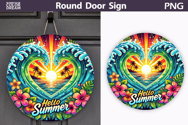 Door Hanger Porch Wall Sign Decor Hello Summer Tropical Round Door Sign Design Tropical Wave Heart Beach Sunset Illustration Coastal Hello Summer Beach Round Decor Ocean Waves Tropical Summer Artwork Summer Beach Sunset Tropical Decoration Tropical Beach Waves Heart Illustration Colorful Hello Summer Ocean Decor Design Tropical Sunset Beach Summer Artwork Coastal Ocean Waves Tropical Illustration