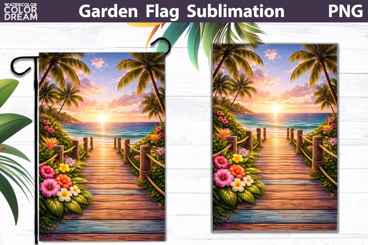 Beach Garden Flag Tropical Island Beach Garden Flag Artwork Summer Coastal Landscape Flag Illustration Palm Tree Beach Sunset Flag Design Tropical Seascape Sunset Garden Flag Design Garden Flag Print Poster T Shirt Puzzle Tropical Beach Boardwalk Garden Flag Design Coastal Boardwalk Beach Flag Sublimation Tropical Paradise Beach Walkway Flag Artwork Coastal Beach Decor Garden Flag Illustration