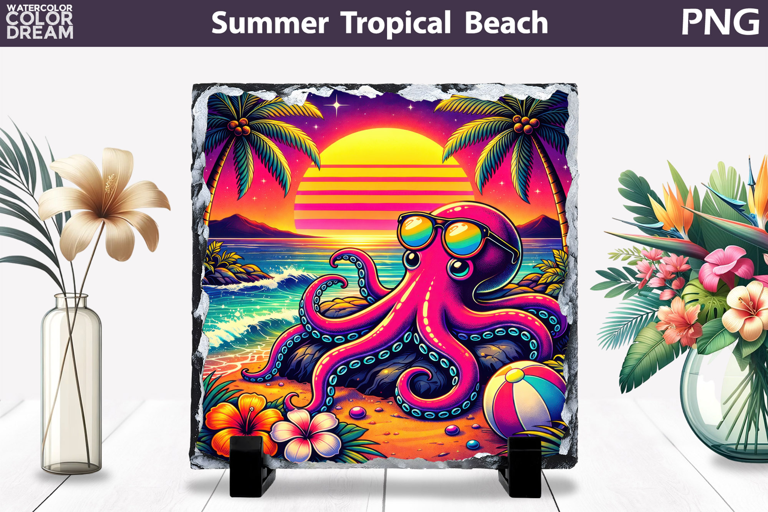 Beach Octopus Tropical Summer Beach Sublimation Slate Pillow Poster Card Puzzle Sign Tote Bag Tropical Summer Animal Sunset Illustration Hibiscus Summer Retro Beach Palm Tree Sunset Sea Animal Summer Neon Sunset Ocean Octopus Illustration Retro Octopus Beach Sunset Design