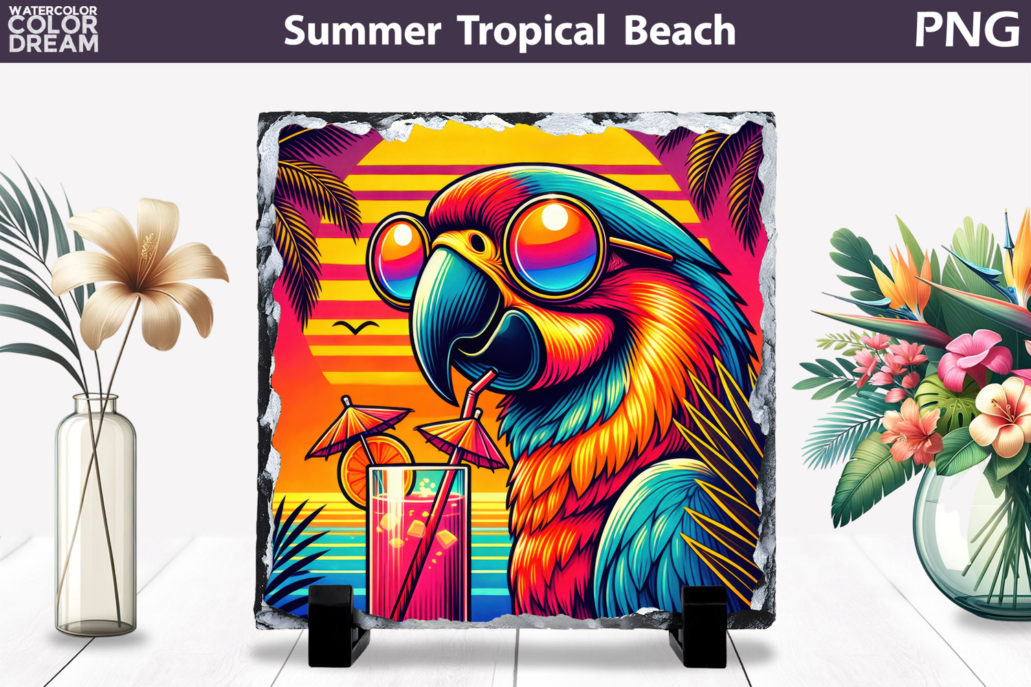 Beach Tropical Summer Macaw Parrot Beach Sublimation Slate Pillow Poster Card Puzzle Sign Tote Bag Tropical Summer Animal Sunset Illustration Hibiscus Summer Retro Beach Palm Tree Sunset Sea Animal Summer Neon Sunset Ocean Macaw Parrot Illustration Retro Macaw Parrot Beach Sunset Design