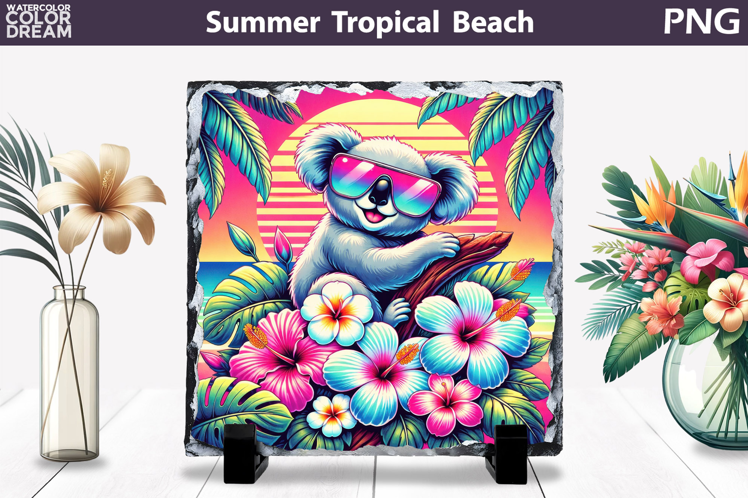 Beach Koala Tropical Summer Beach Sublimation Slate Pillow Poster Card Puzzle Sign Tote Bag Tropical Summer Animal Sunset Illustration Hibiscus Summer Retro Beach Palm Tree Sunset Sea Animal Summer Retro Koala Beach Sunset Design Neon Sunset Ocean Koala Illustration