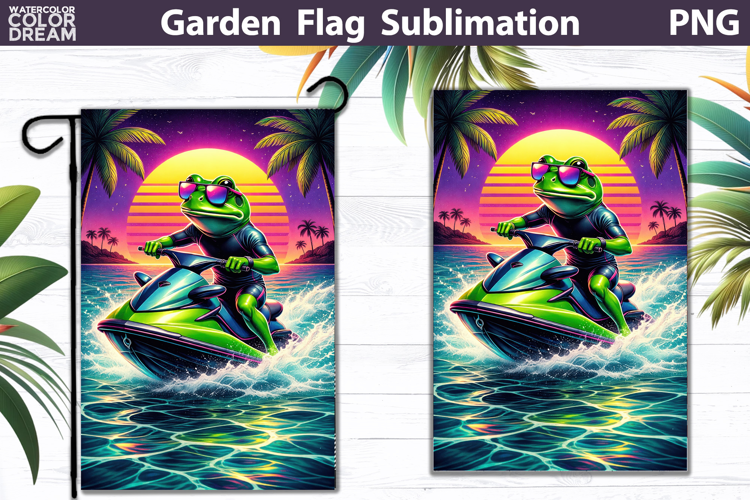 Frog Jet Ski Garden Flag | Tropical Sunset Ride example image 1