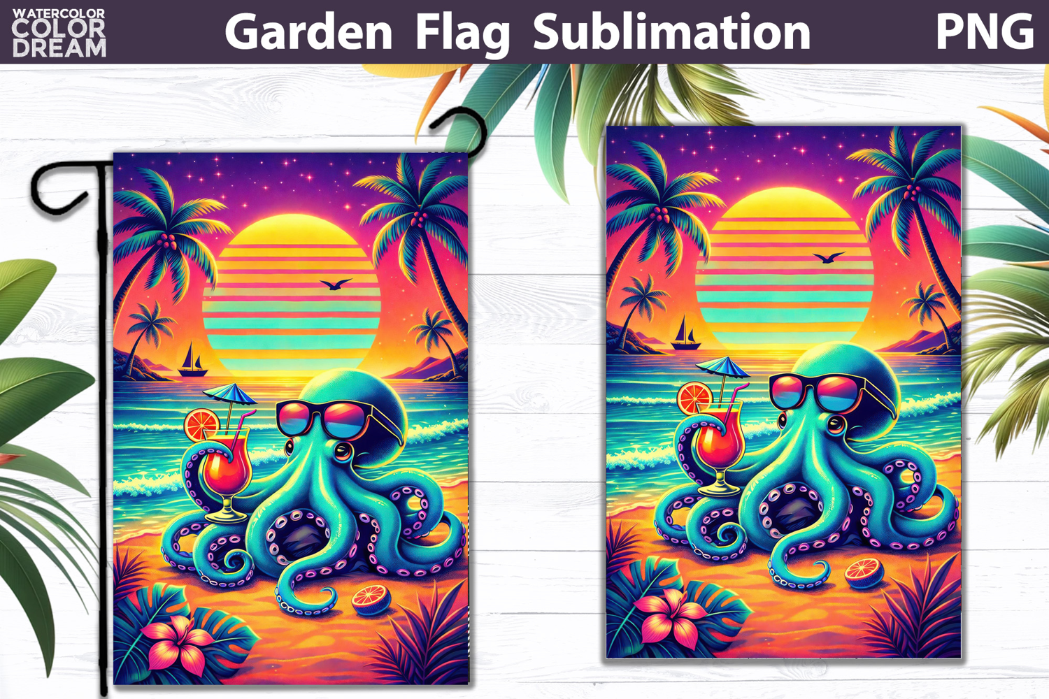 Octopus Cocktail Garden Flag | Tropical Sunset Beach example image 1